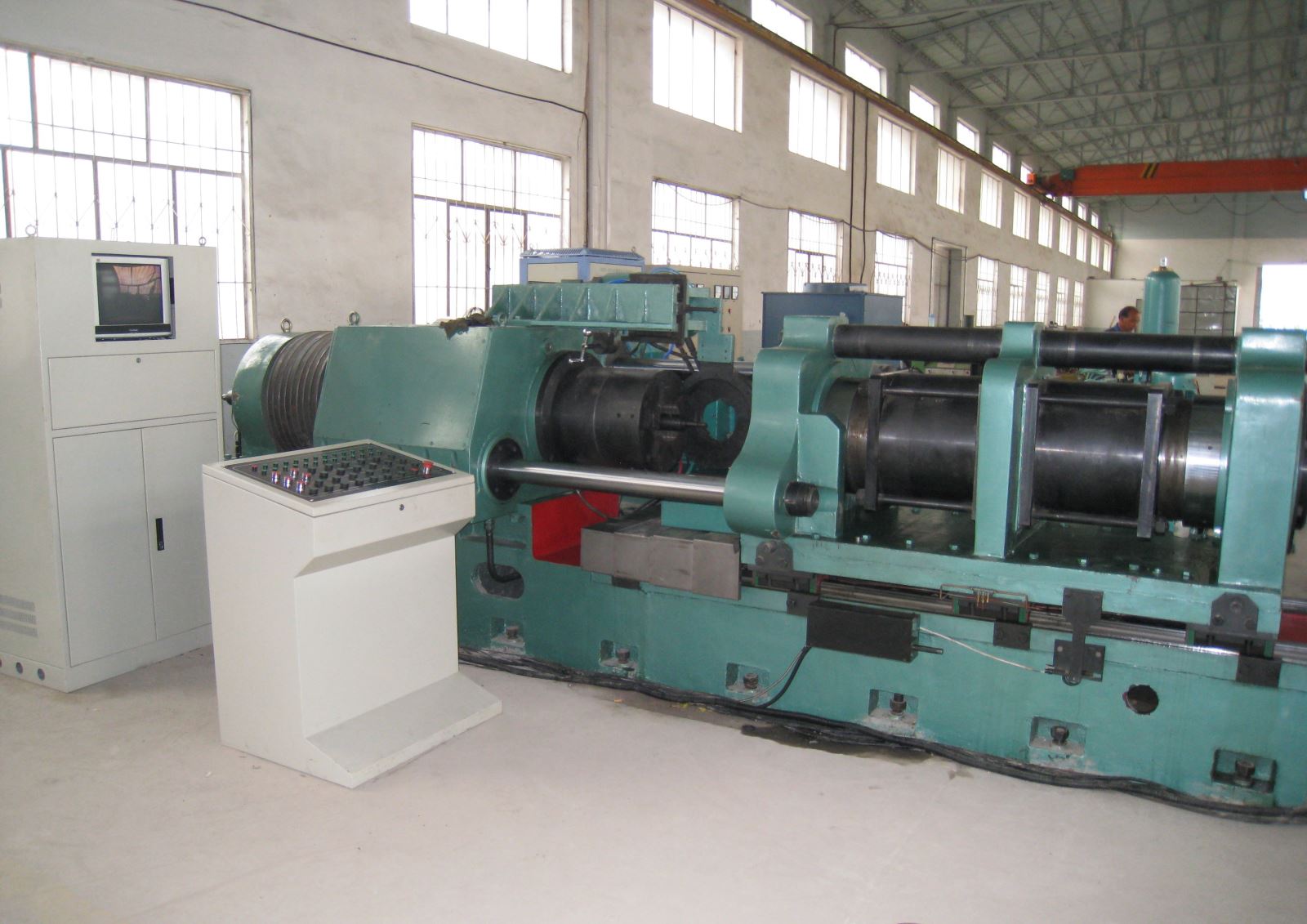 ● 主軸箱采用兩個(gè)單列圓柱滾子軸承的結(jié)構(gòu)方式,具有旋轉(zhuǎn)精度高的優(yōu)點(diǎn),同時(shí)在主軸箱中設(shè)置兩個(gè)推力調(diào)心滾子軸承, 一個(gè)采用固定安裝方式,另一個(gè)采用平衡油缸活動(dòng)安裝的獨(dú)特結(jié)構(gòu)方式,來平均承載摩擦與頂鍛的軸向力,使用壽命提高數(shù)倍。